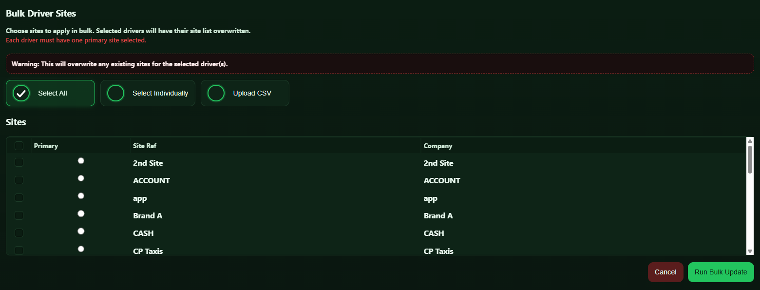 You can now bulk assign sites and primary sites directly from the CabbiCore console when viewing: